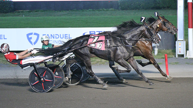 Favorite Emoticon Legacy held sway with Louis Roy in the bike again for trainer Luc Blais in the first elimination. The homebred son of Walner-Emoticon Hanover made a winning move brushing through the :55.1 half to take the lead to a speedy 1:24.1 three-quarters and, with a last quarter in :27.3, recorded a nose win in a 1:51.4.