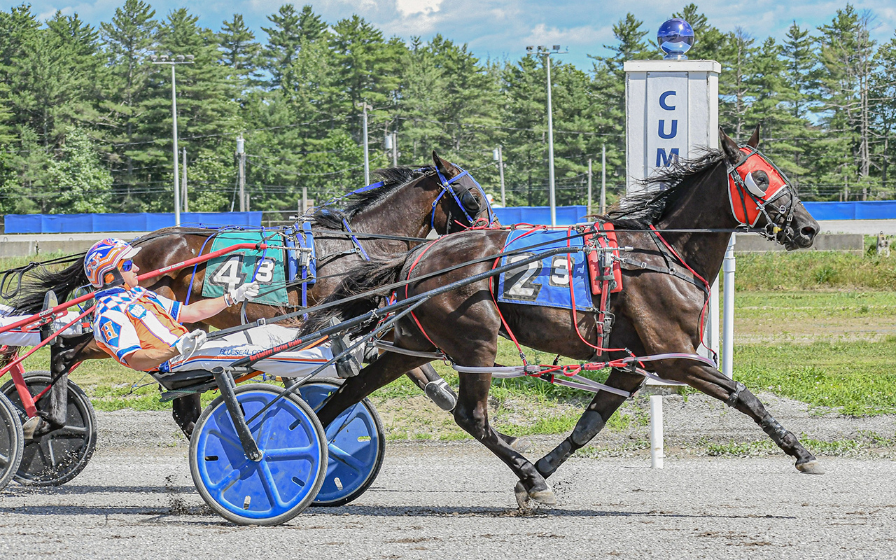 CUMBERLAND, ME – Maine’s fresh crop of 2-year-old pacing colts and geldings put on a harness racing show during Friday’s (July 4) Independence Day card at Cumberland Raceway, opening the program with two $10,500 divisions of the Maine Sires Stakes.