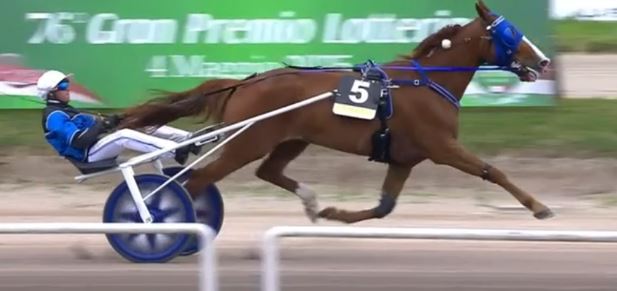 In the Lotteria batterias (each for a purse of 25,300€ and raced over 1600 meters autostart) the first such test went to 38.4/1 odds Dubhe Prav (6m Robert Bi) down the passing lane with Santo Mollo up, finished ahead of 20.7/1 Bleff Dipa and Roberto Vecchione and 2.2/1 Dany Capar (6m Exploit Caf) for Alessandro Gocciadoro. Usain Toll was fourth in this elim timed in 1.10.5kr.