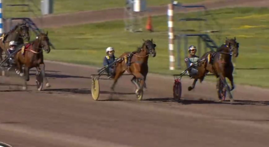 The co-featured Hertiginnan av Vastergotland (purse to winner 150,000SEK, 2140 meters autostart, 12 starters)was won by 21/1 odds Gordini Brick (7g Orlando Vici-Keystone Nora-Yankee Glide) with Hanna Forslin up for trainer Jasmine Ising.
