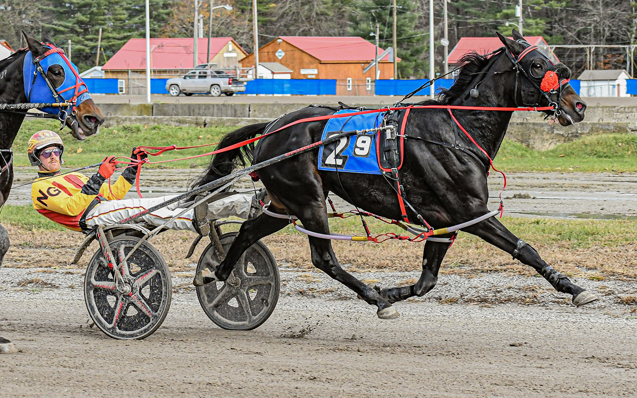 CUMBERLAND, ME – Local pacer Arts Flight (Artistic Fella) captured his second $5,000 harness racing feature in as many weeks on Sunday (Nov. 16) at Cumberland Raceway, this time with Nick Graffam in the sulky.