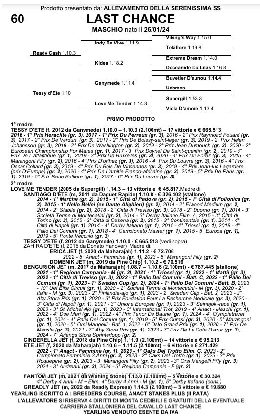 - Lot 60, Last Chance (male, Ready Cash-Tessy d’Ete) for 210,000€ to Scuderia Incolinx;