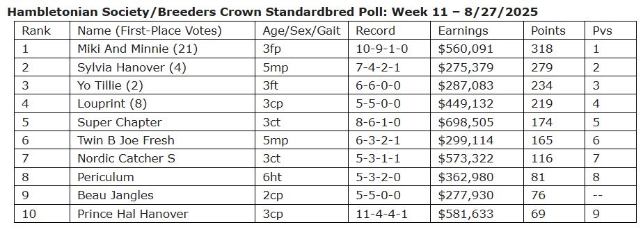 There was little other movement in the Top 10, with the first eight positions remaining unchanged. Miki And Minnie, who won the third leg of the Kentucky Sire Stakes Championship Series for 3-year-old female pacers at Lexington’s Red Mile on Monday, was voted No. 1 for the fourth consecutive week and was followed by Sylvia Hanover, Yo Tillie, Louprint and Super Chapter in the top half of the rankings.