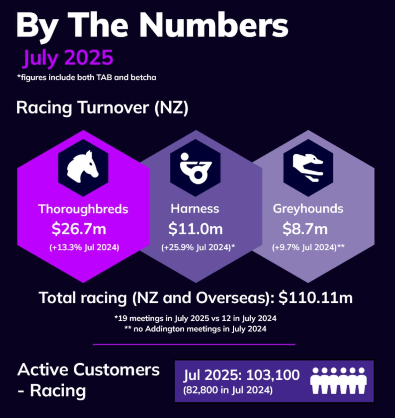For the month of July in comparison to last year, Greyhound Racing was up by 9.7% ($8.7 million), Thoroughbred Racing 13.3% ($26.7 million) and Harness Racing 25.9% ($11.0 million).