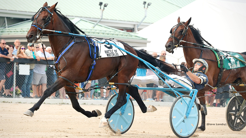 The $227,100 Battle of Waterloo, presented by Winbak Farm, final went forward with a field of eight colts and geldings, no eliminations required. Beau Jangles and driver Bob McClure left aggressively, with Tilthecowscomehome (Jody Jamieson) and three-wide D A Lets Dance (Doug McNair) to his outside, as Borderline Mobby (James MacDonald) sat fourth behind them. McNair’s 51/1 longshot made front before the 26.3 opening quarter, but quickly faced first-over pressure from Titlthecowscomehome, shadowed by second-over 2/5 favourite Beau Jangles, who made front after a brief three-wide move.