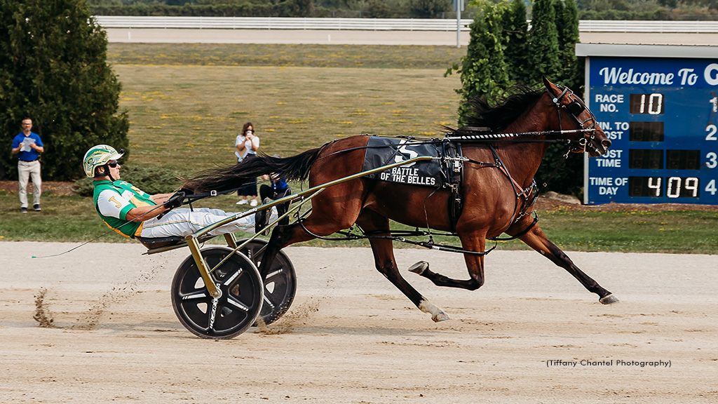 Daya (p,2,1;50.4f; $127,600) lowered Romantic Beauty’s 1:52.2f track record for 2-year-old filly pacers, set in that rival’s Battle of the Belles elimination. The homebred daughter of Bulldog Hanover-Beach Of A Time is owned by Jack Darling Stables Ltd. She has won 3 of 4 seasonal starts, finishing second in OSS Gold leg #2 at Mohawk July 17 before rebounding to win her July 28 Battle of the Belles elim in 1:53.3f.