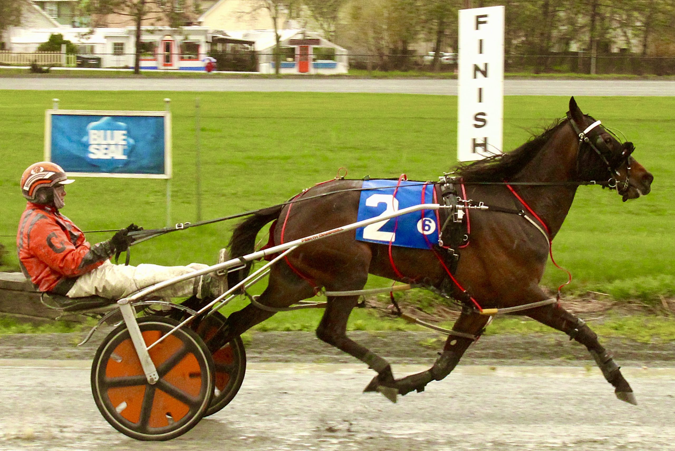 Bangor, Maine … Driver Heath Campbell dominated the rain-drenched harness racing program at Bangor Raceway on Sunday (May 4), wallowing over the gooey-going, while powerfully posting three consecutive winning efforts.
