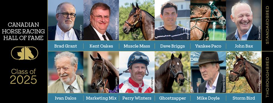 The CHRHF Class of 2025 included John Bax (Standardbred Trainer), Dave Briggs (Standardbred Communicator), Brad Grant (Standardbred Builder), Kent Oakes (Standardbred Builder), Muscle Mass (Standardbred Male Horse) and Yankee Paco (Standardbred Veteran), Ivan Dalos (Thoroughbred Builder), Mike Doyle (Thoroughbred Trainer), Perry Winters (Thoroughbred Jockey), Ghostzapper (Thoroughbred Male Horse), Marketing Mix (Thoroughbred Female Horse) and Storm Bird (Thoroughbred Veteran).