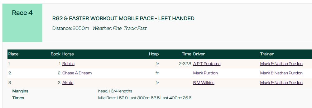 Chase A Dream (Captaintreachrous) took on stablemates Rubira and comeback pacer Akuta in the 2050m mobile, with Purdon driving Chase A Dream and giving them a small start early to try and maximise the trial’s effectiveness.