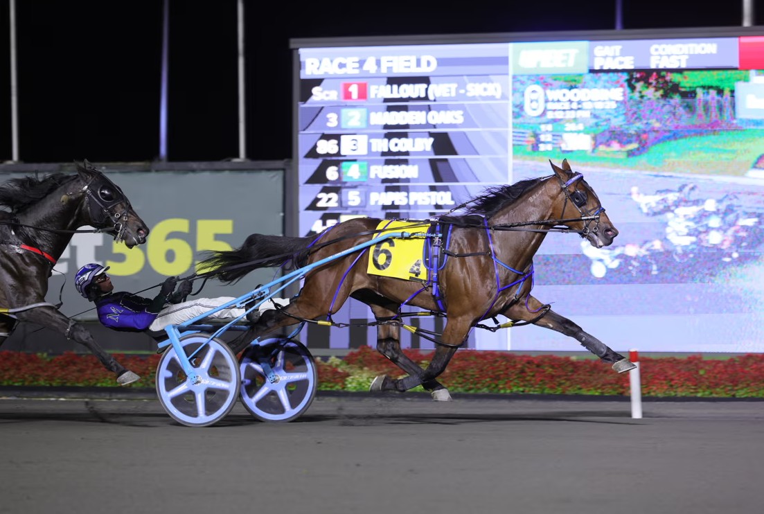 MILTON, October 18, 2025— Hunter Oakes trainee Dandy Ideal (American Ideal) ended Louprint’s unbeaten sophomore season when keeping the North America Cup champion at bay through an all-out stretch drive to win the second of two $34,250 CAD Breeders Crown eliminations for 3-year-old pacing colts and geldings in a 1:48 mile on Saturday at Woodbine Mohawk Park.