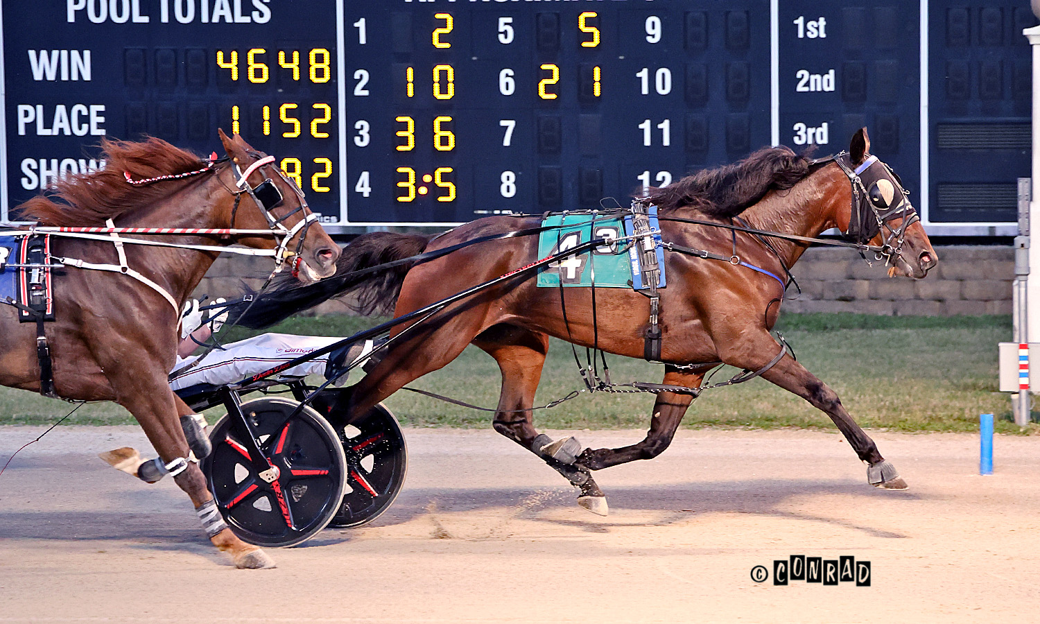 Soulful Saul (Brett Miller) recorded the fastest mile among the four divisions of trotters, winning the division of freshman colts in a lifetime-best 1:53.3, overtaking his previous mark of 1:55.1. The Ready For Moni gelding rallied from sixth place at the halfway mark to edge Tom Largo (Chris Lems) by a nose. Where Theres Smoke (Sam Widger) led the field past the first two calls in fractions of :27 and :55.3. Tom Largo moved first up and into the lead going to the 1:24.3 three-quarters. On the outside, Soulful Saul continued to reel in Tom Largo down the final stretch en route to the photo-finish victory. Grape Crush (Page) was third. Soulful Saul is trained by Steve Carter for Jay Mossbarger, Peggy Carter, and Philip Skinner. He has hit the board in nine of 13 seasonal starts with four wins and $94,569 in earnings.