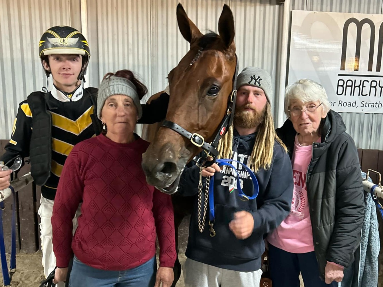 Jennifer Douglas celebrates her first training double with driver Jordan Leedham, square gaiter Mitchell Wrap, her son Brock Gibson and her mum Judy Douglas (Victorian Square Trotters Association photograph)