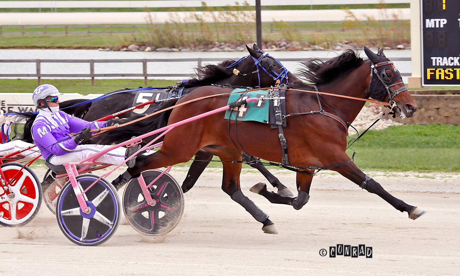 In a $17,000 conditioned trot, E Pass (Chris Page) went gate-to-wire to record a neck victory over the fast closing and favorite Grand Revival (Jeremy Smith) in 1:55.3.
