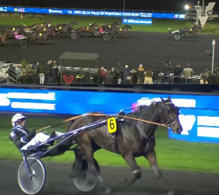 The  J.P. Bragato  owned trotteur now sports six career wins  in 14 starts for 93,605€. Lili Dry (4f Goetmals Wood-Giulia Josselyn) ended second at 12/1 for trainer/driver Antonin Andre and Ecurie Dry. La Diva Supreme (4f Charly du Noyer) was third at 41/1 odds driven by Mathieu Mottier for Ecurie Supreme and trainer Marc Sassier.