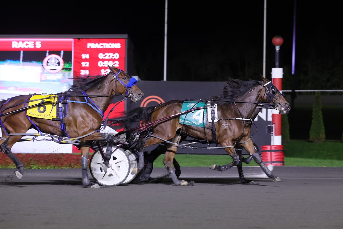 MILTON, October 25, 2025— For just the second time in the 41-year history of the Breeders Crown, a pair of horses hit the finish line in a dead-heat for the win. Miki And Minnie (Always B Miki) and The Last Martini (Huntsville), after finishing one-two in last year’s 2-Year-Old Filly Pace, matched strides crossing the beam in a 1:49.2 mile to tie for the harness racing victory in the $822,000 Breeders Crown 3-Year-Old Filly Pace on Saturday night at Woodbine Mohawk Park.