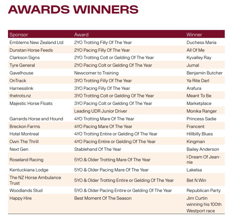 Top Australian pacer Kingman won 4YO Pacing Colt/Gelding of the year after his hit and run mission across the Tasman where he won the IRT New Zealand Cup and the Group 1 Christian Cullen while the top 4YO and 5YO Trotting Entires/Geldings were emerging star Hillbilly Blues and last year’s Reharvest Rowe Cup winner Bet N Win.