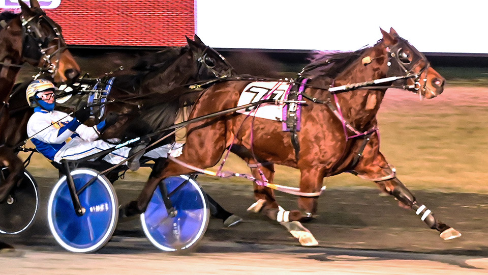Horse, of course! William Daggett Jr. and Lawrence Vukovic’s Horse sprang a 17-1 upset in the $10,000 top-level pacing feature, stalking an extended duel between favorites Don’tmesswithles and Doubleornothing N through the far turn before emerging up the open stretch to defeat the late-closing Rock Smart by a head in 1:52. Billy Carter trains and drove the 8-year-old Vertical Horizon gelding, who paid $36.80 to win.