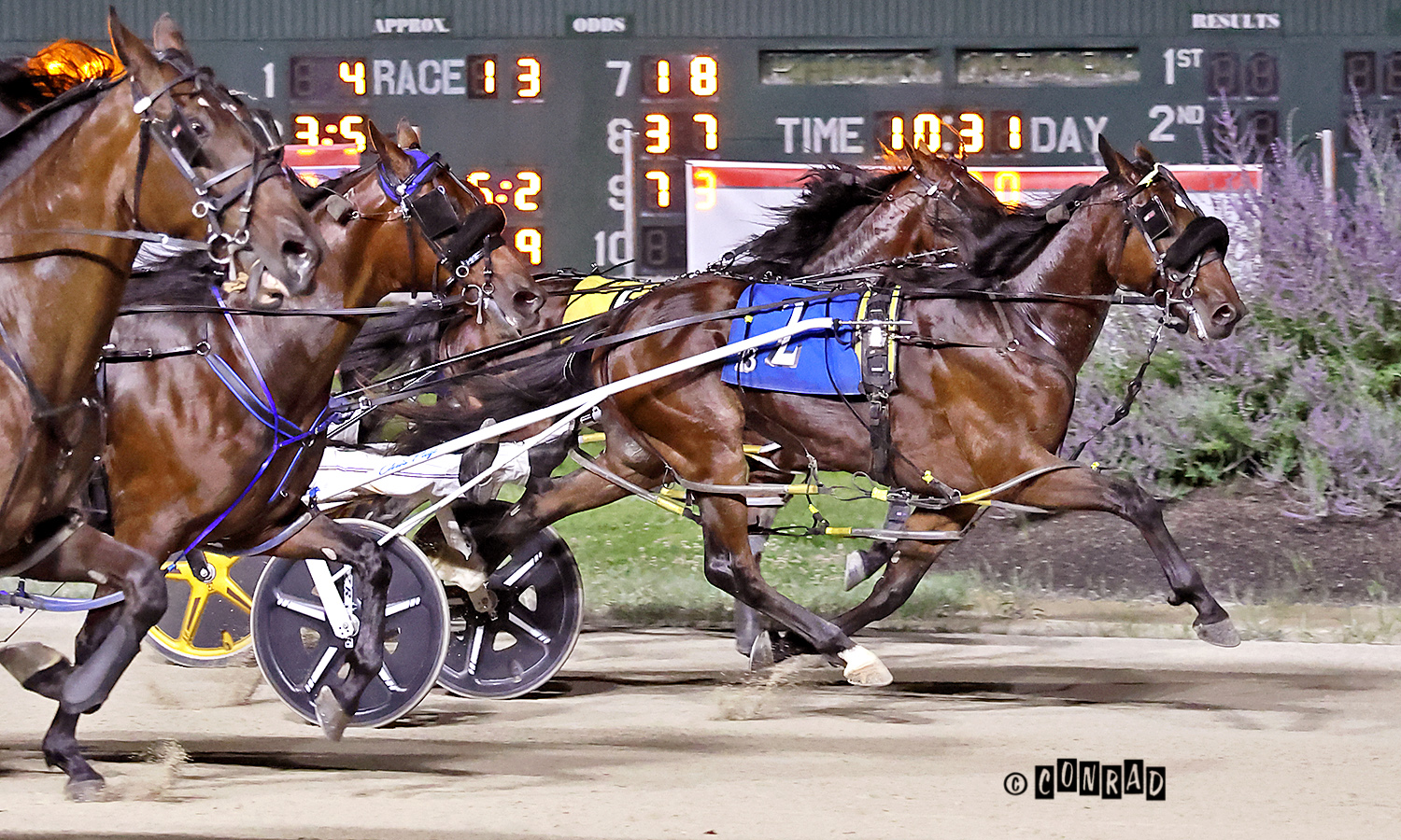 She’safirewoman (Luke Hanners) is the 2-1 morning line favorite in the first division. The Mark Winters trainee has hit the board in both starts this season, winning at Circleville with Nisonger in 2:01.2 on June 14 and finishing as the runner-up to Shacarri in 1:51.3 at Scioto on July 5 with Luke Hanners. Her lifetime best of 1:55.1 came in a qualifier at Scioto on June 30. The Catch The Fire filly is owned by Harry Horowitz. Steve Bauder trainee Rodeo Dancer (Brett Miller) is the 5-2 second choice in this division.