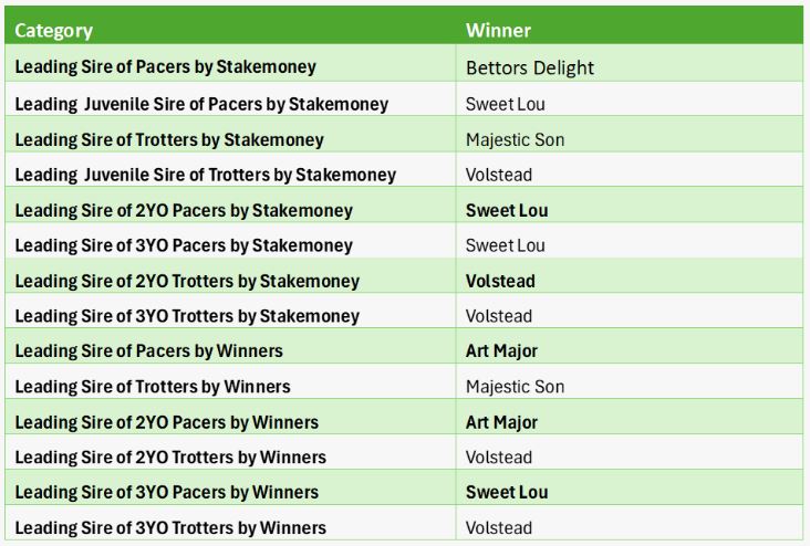 In trotting ranks, Majestic Son extended his dominance with a ninth successive title for prize money earned by his progeny.