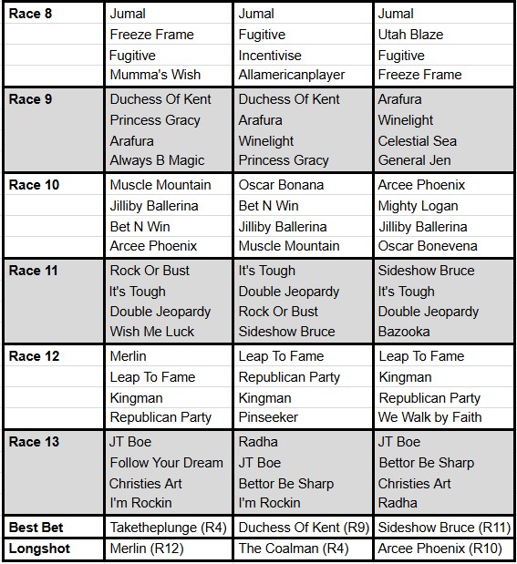 2 3X4749 Captain Kobe Has not had a lot of luck and drawn well for this. Has place claims at big odds