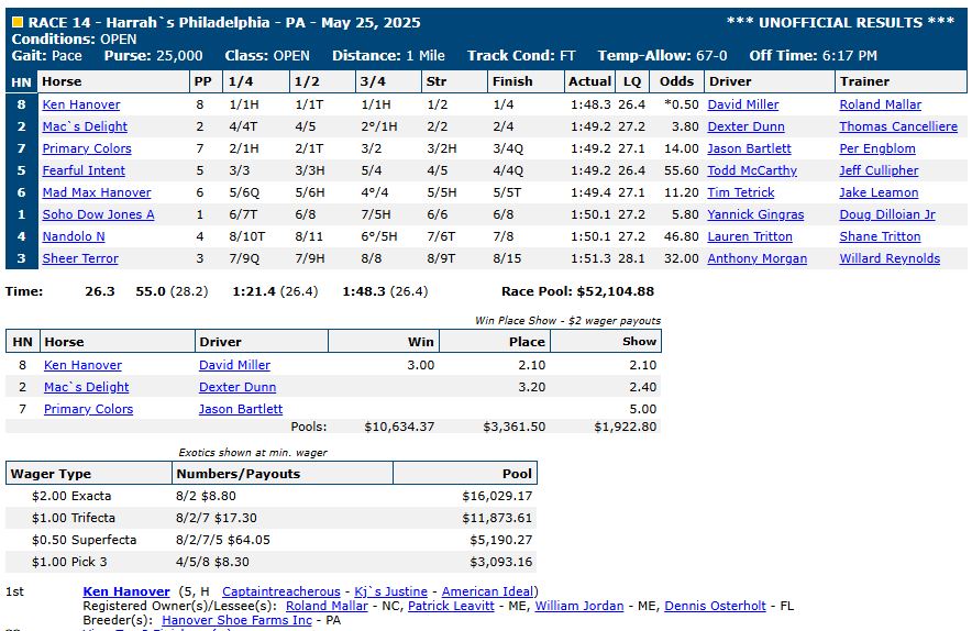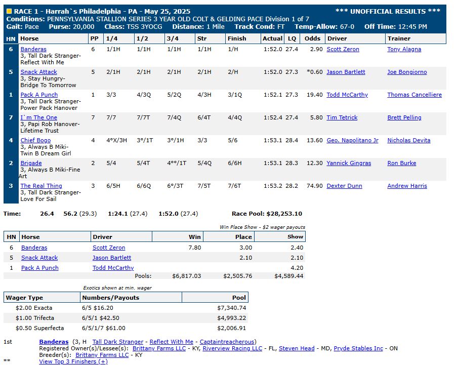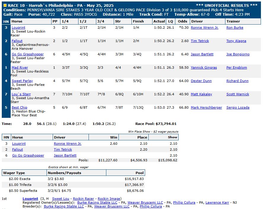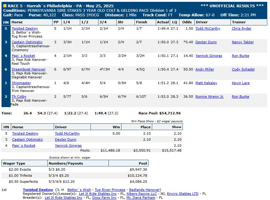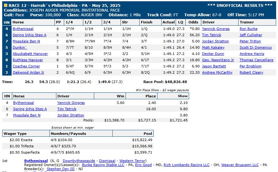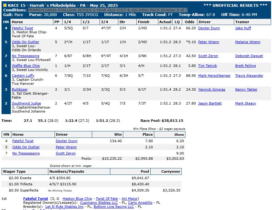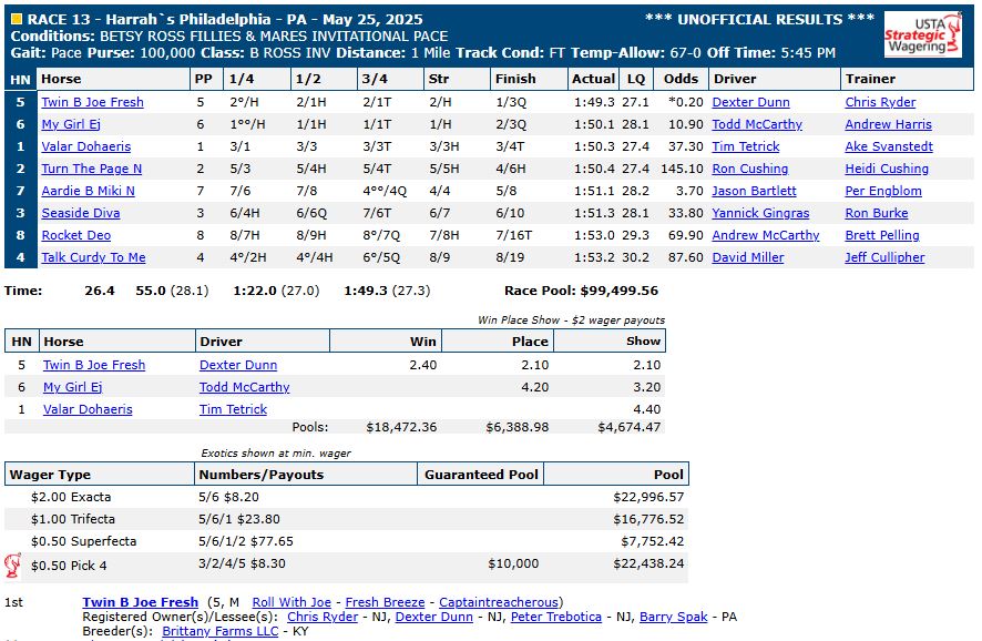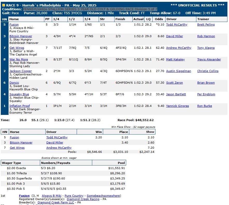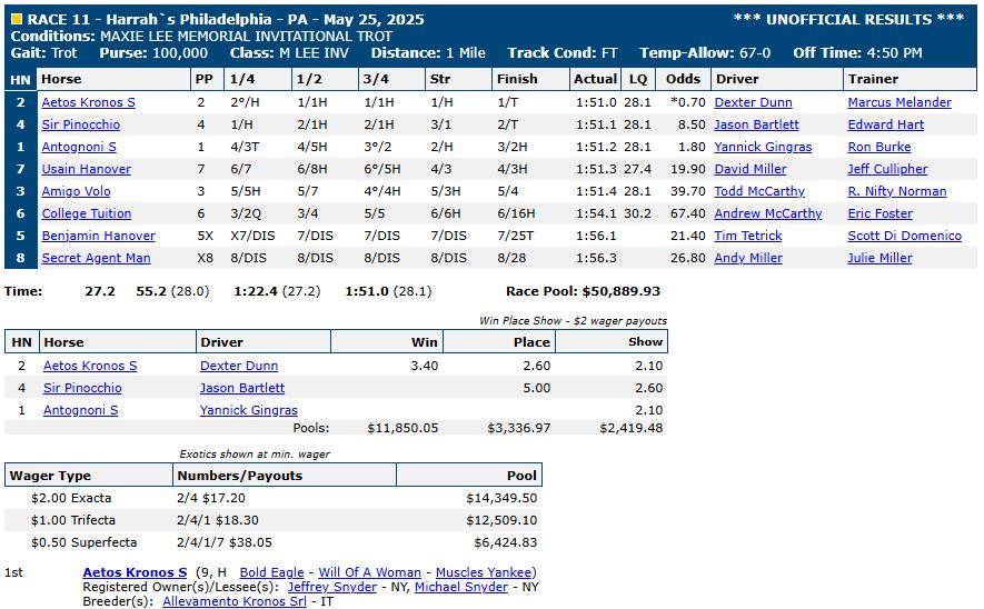For complete race results, click here: US Trotting results.