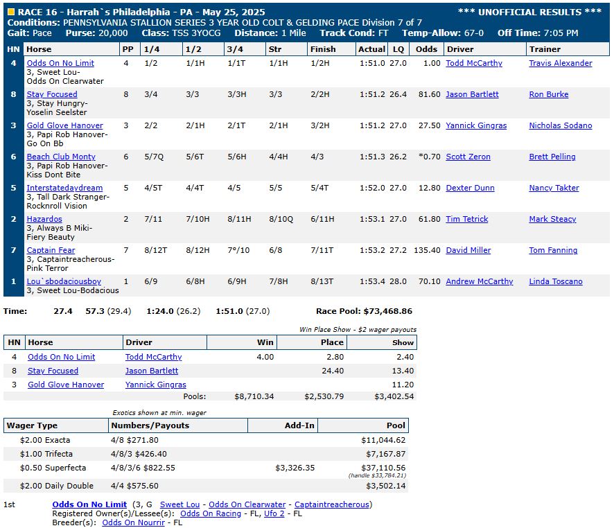 RACE 16 PENNSYLVANIA STALLION SERIES 3 YEAR OLD COLT & GELDING PACE Division 7 of 7