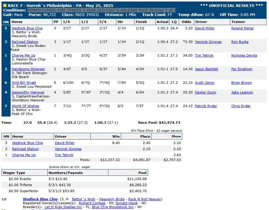 RACE 1 PENNSYLVANIA STALLION SERIES 3 YEAR OLD COLT & GELDING PACE Division 1 of 7