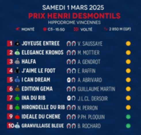 On Saturday at Vincennes there will be five groupe level trots with three of those groupe I tests. A fine finale to the Winter Meet. The key races are the Prix de Selection (Gr. I, purse 240,000€, 2200 meters, 14 starters ages 4-6) led by Keep Going; Prix Henri Desmontils (monte Gr. I International, 240,000€ purse, 2850 meters, 10 starters ages 4-11) as shown below; Prix des Centaures (monte Gr. I, purse 240,000€, 2700 meters, 12 starters ages 4-6).
