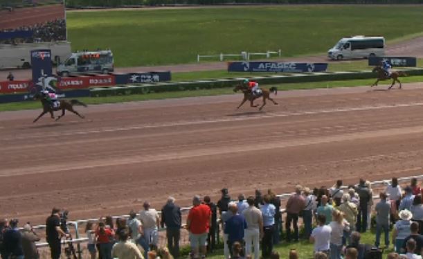 On the May 10 Caen undercard was the Prix Pierre Gamare – Etrier 3 And Q5 (monte Gr. II, purse 120,000€, 2450 meters, 12 starters three year old open) went to 17/1 odds Mhum Flying (3m Helgafell-Catalina du Pont) timed in 1.13.1kr for jockey Victor Saussaye.