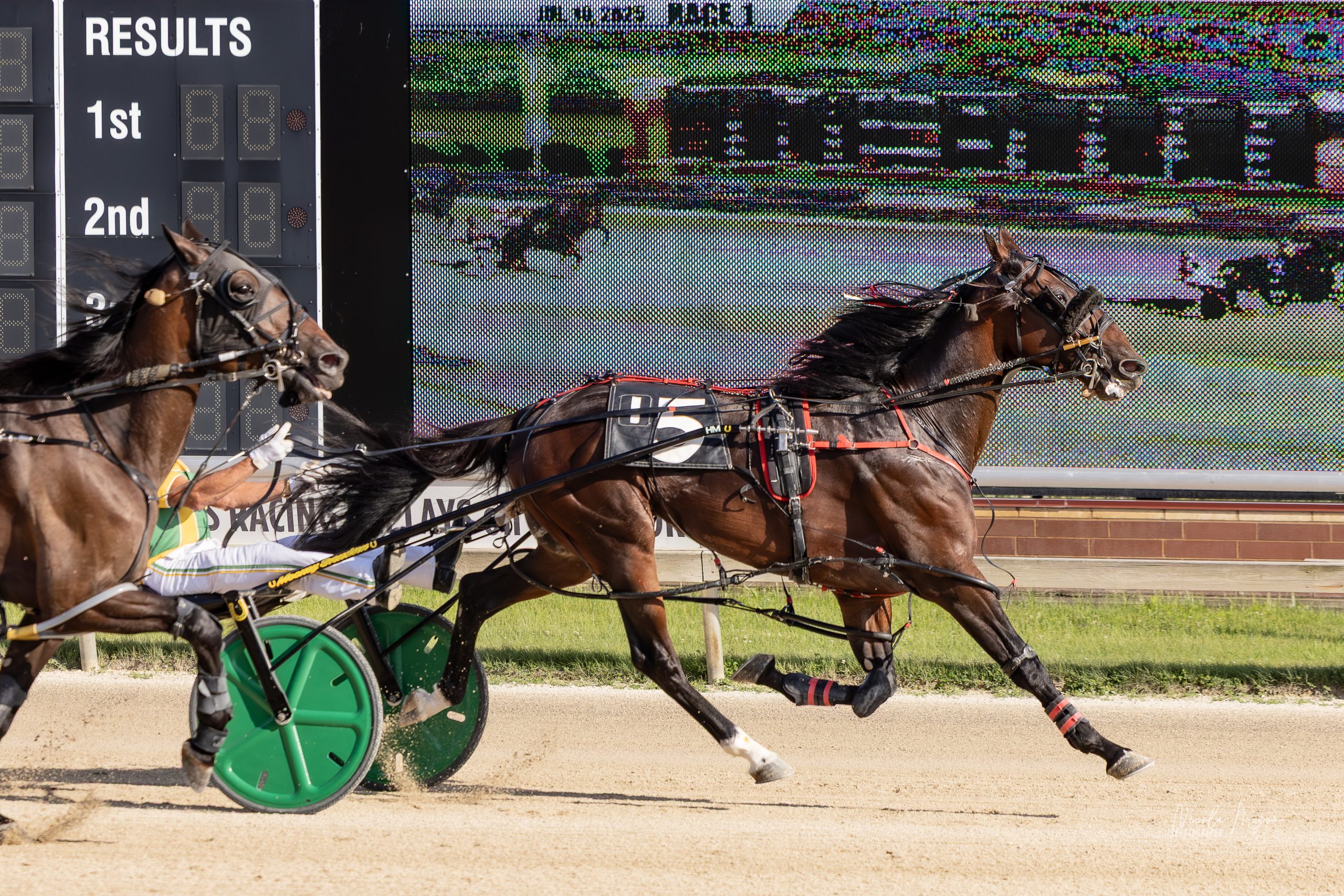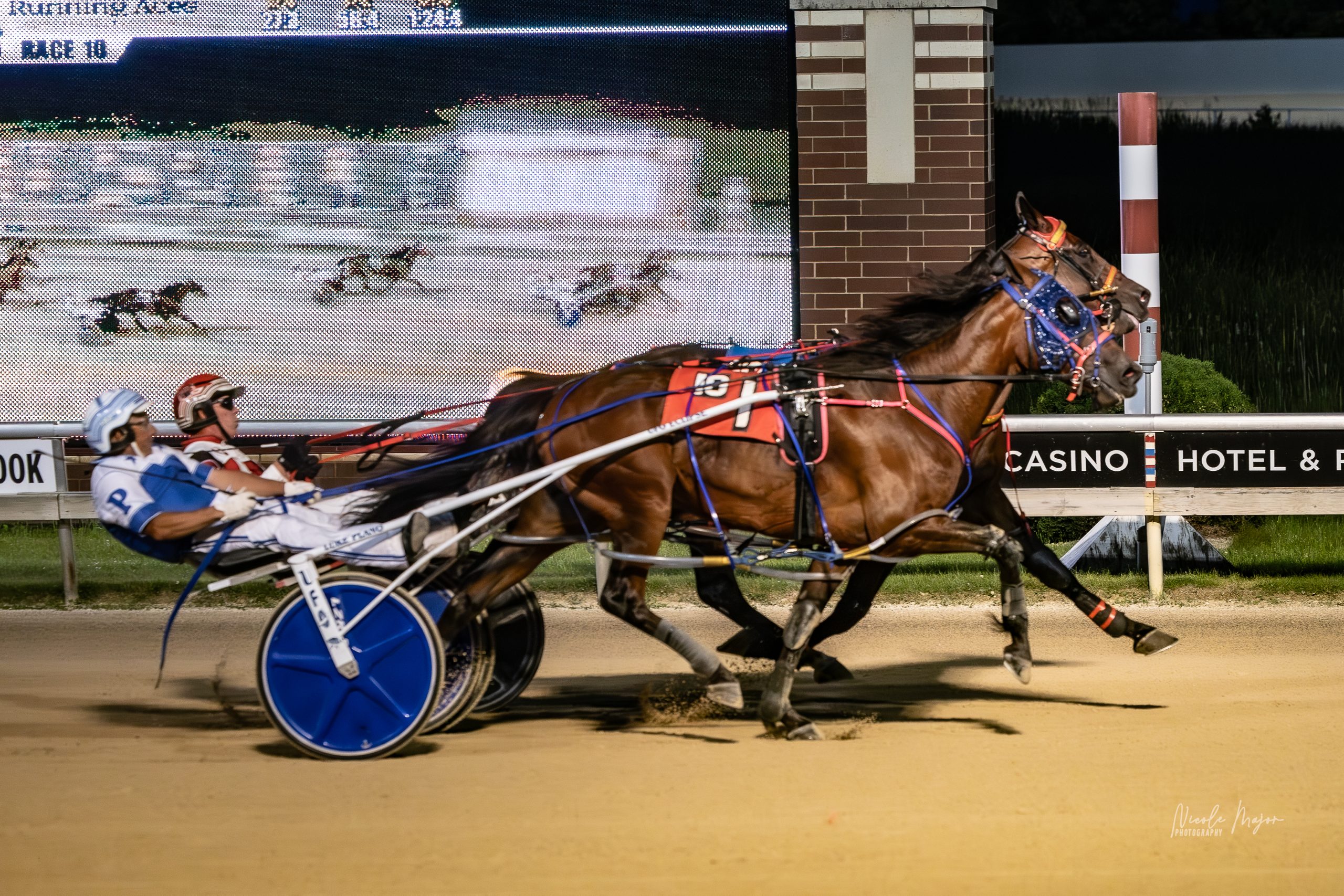 Columbus, MN – The Thursday night (July 10) harness racing program at Running Aces featured the $14,750 Mares Open pace with a well matched field of eight distaffers lining up behind the gate.