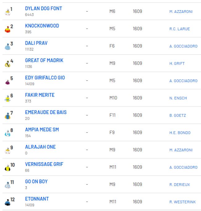 On Sunday at Cagnes sur Mer is the Gr. I Grand Criterium de Vitesse de la Cote d’Azur (purse 200,000€, 1609 meters, 12 European starters ages 4-11) with a field of 12 at the start as shown below.