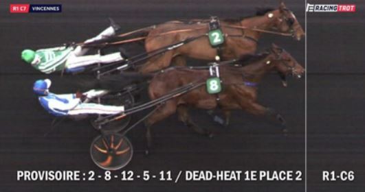 The Prix de Villeral (purse 35,000€, 2100 meters autostart, 13 five year old starters) on this card produced a stirring dead heat timed in 1.11.8kr between 2.9/1 odds Knock Out Maker (5g Love You-Beltissima Dubrio) from post two and 1.9/1 odds favorite Kowait de Chenu (5g Rodrigo Jet- Bonne Citronnade) from post eight.