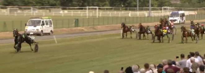 This was his eighth career victory for 197,520€ earned. The 25 meter handicapped and 32/1 odds Hello Paname (8g Lets Go Along) was a distant second for driver Matthieu Verva, trainer J-R Delliaux and the same owner Ecurie du Damier. Helios Si (8g Infant du Bossis) was third for trainer/driver Sebastian Hardy at 25/1 matching his 25 meter penalty. Hero Sibey (8g Niky) was fourth at 3.4/1 odds and handicapped 50 meters with trainer Damien Bonne driving for Yannick Desmet. The 115/1 Falco du Hamel (10g Queroan de Jay) was fifth handled by Wilfried Jehanne for owner/trainer Emmanuel Varin.