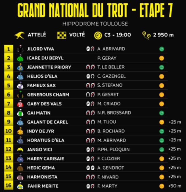 Hidalgo des Noes was fourth at 9/1 and handicapped 50 meters handled by Romain Derieux, with 2.6/1 odds and 25 meter handicapped Jour de Fete home fifth for Nicolas Bazire.