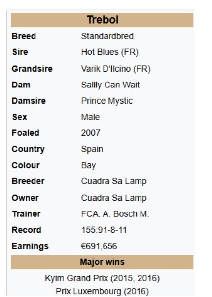 during the race’s first two laps, he came from behind to pass the leader Maven and hold off a late charge from Oasis Bi. Trebol’s victory was the first win of an international Group 1 race by a trotter bred in Spain. Trebol won the Kymi Grand Prix again in 2016, getting up in the final strides for his second (and final) Group 1 victory. Later that year he won the Group 3 Prix Luxembourg, his biggest career win in France. After a winless year of international racing, Trebol was brought back home to Spain to race at Mallorca’s Hippodrome San Pardo and easily won a 3,150-metre race. It was originally meant to be his final career start.