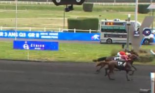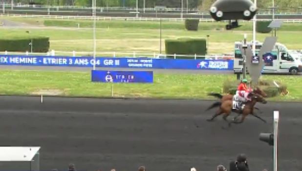 The Gr. II Prix Gai Brillant – Etrier 3 Ans Q3 (purse120,000€, 2175 meters, eight three year old males) saw 7/10 odds favorite Meteore de Simm (3m Boccador de Simm-Apres La Plume) scored timed in 1.14.4kr.