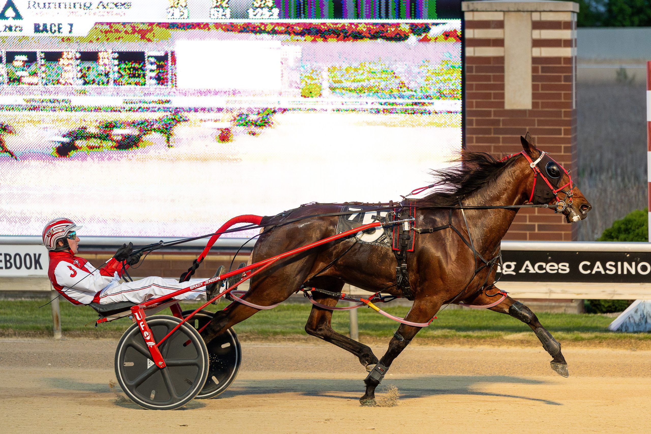 Columbus, MN – The featured event on the Thursday night (May 22) card at Running Aces was the $14,750 Mares Open Pace which offered a talented field of eight competitors. The betting public honed in on six-year-old Kele Kele (So Surreal) as their top choice at 4-5 and she did not disappoint her backers, delivering a strong performance in her local debut.