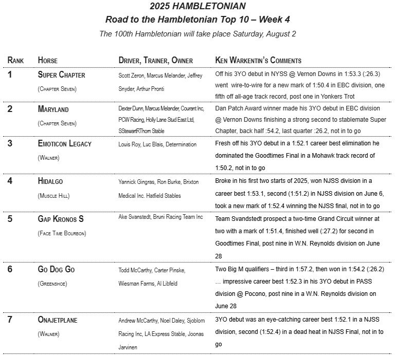 East Rutherford, NJ – No change to Ken Warkentin’s Top 10 in the Week 4 harness racing edition of the 2025 Road to the Hambletonian Presented by Fanduel.