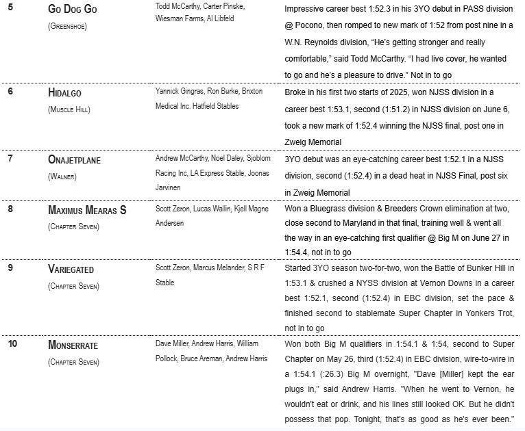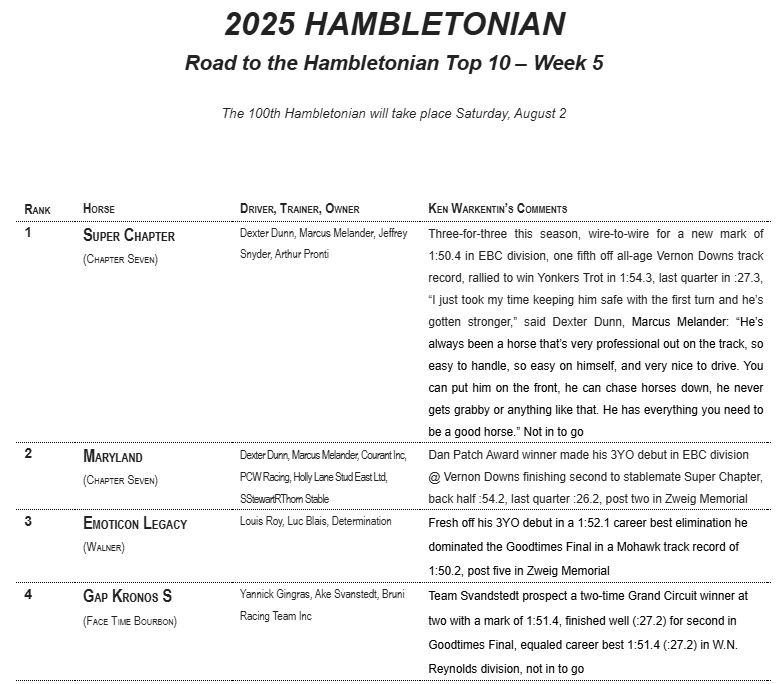 East Rutherford, NJ – Gap Kronos S and Go Dog Go each move up a spot in week 5 of Ken Warkentin’s Road to the 2025 Hambletonian Presented by FanDuel. Four harness racing horses in the top ten are facing each other in the Zweig Memorial this Thursday at Vernon Downs.
