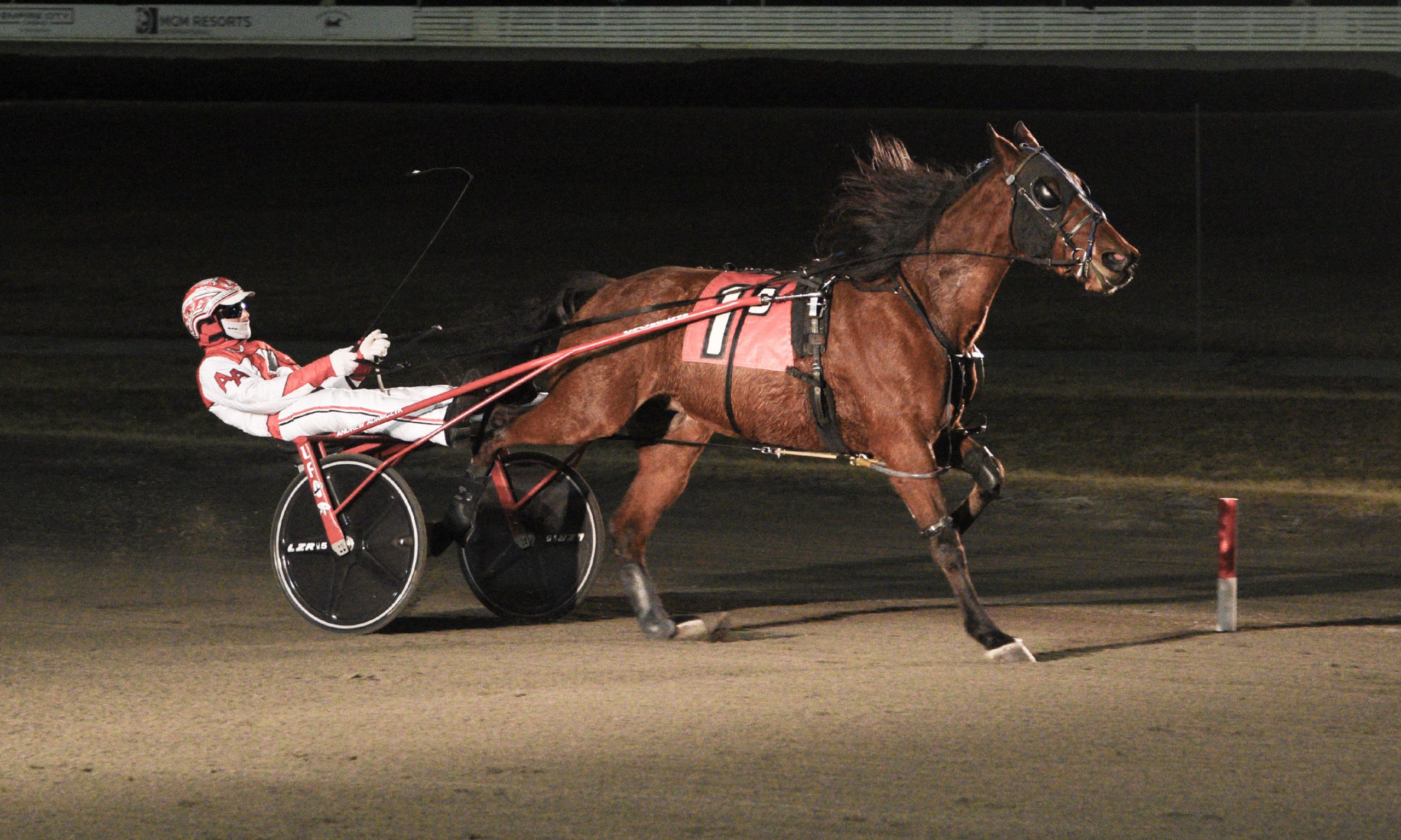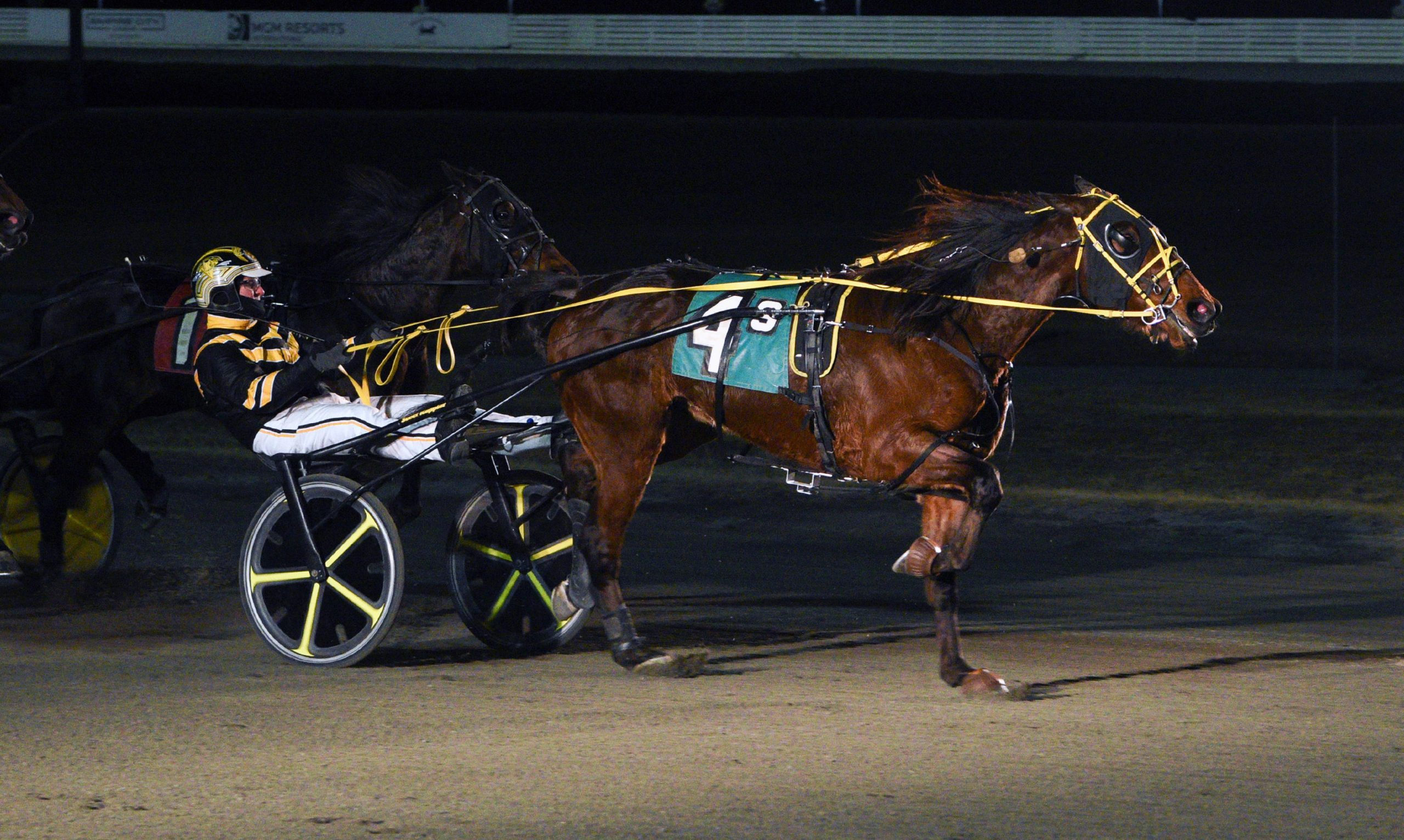 Leaving from the pylon post, Adamczyk secured the pocket as Muscle Dan (driven by Tony Ciuffetelli) launched to the lead moving for a :28.3 first quarter. Big Charlie Moran (Joe Lee), the 7-5 favorite, pushed forward but was caught on the rim moving to a :58.2 half.