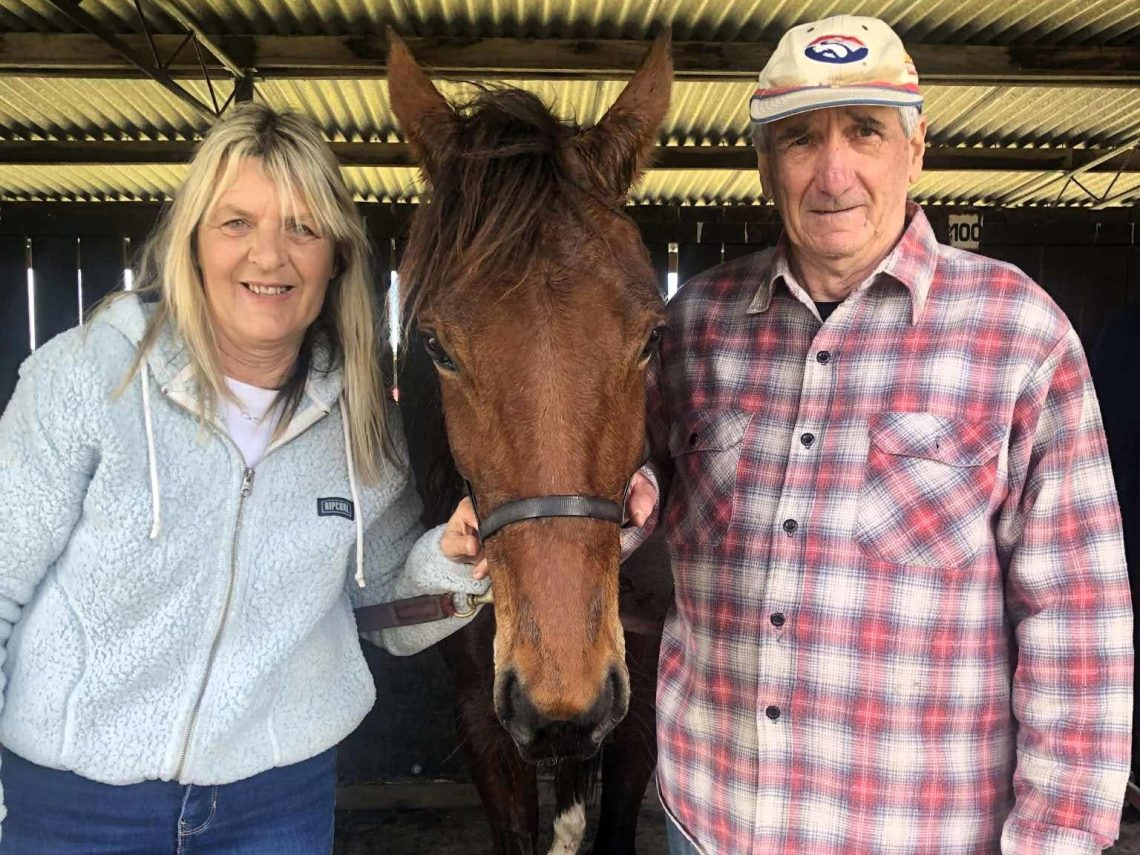 Victorious trainer Daryl Prosser and his partner Judy with Ataboy Charlie after their win at Maryborough (Victorian Square Trotters Association photograph)