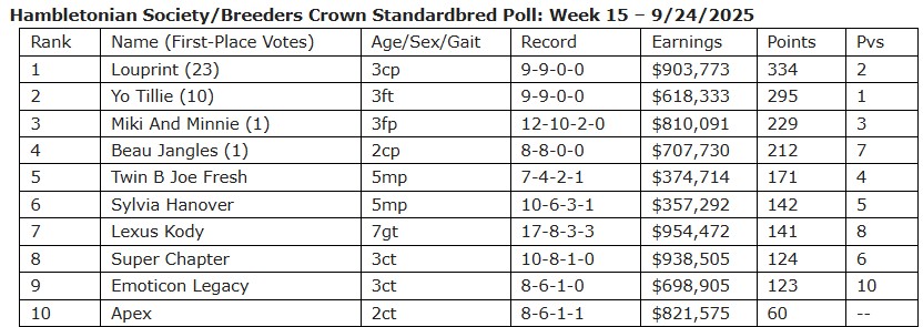 Little Brown Jug winner Louprint (Sweet Lou) returned to No. 1 in the Week 15 harness racing edition of the Hambletonian Society/Breeders Crown poll released Wednesday while Beau Jangles moved into the top five and Apex joined the Top 10.