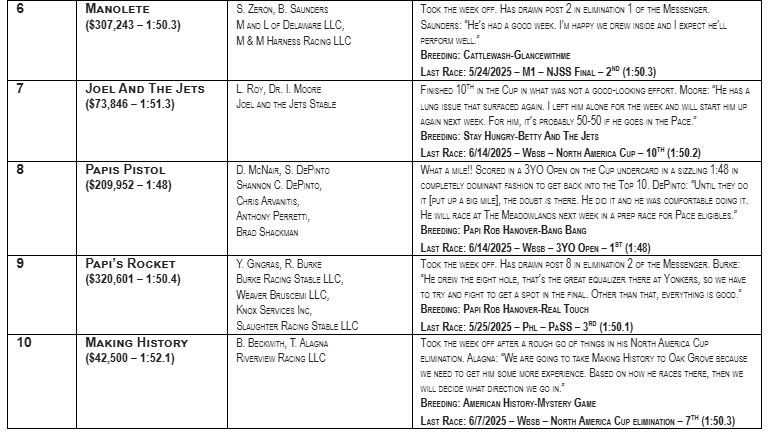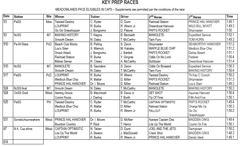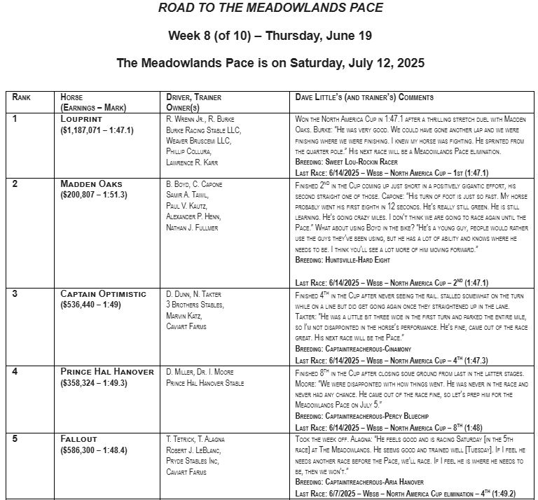 EAST RUTHERFORD, NJ — Louprint (Sweet Lou) delivered a powerhouse harness racing performance in the North America Cup, while Madden Oaks brought big thrills for a second straight start at Woodbine Mohawk Park, putting the pair in the top two spots of Dave Little’s Road to the Meadowlands Pace poll. The Top 10 has seen Louprint at No. 1 for each of the eight weekly installments, with just two to go before Meadowlands Pace eliminations take place.