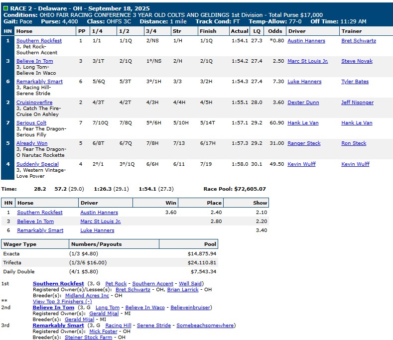 Conditions: OHIO FAIR RACING CONFERENCE 3 YEAR OLD COLTS AND GELDINGS 2nd Division – Total Purse $17,000