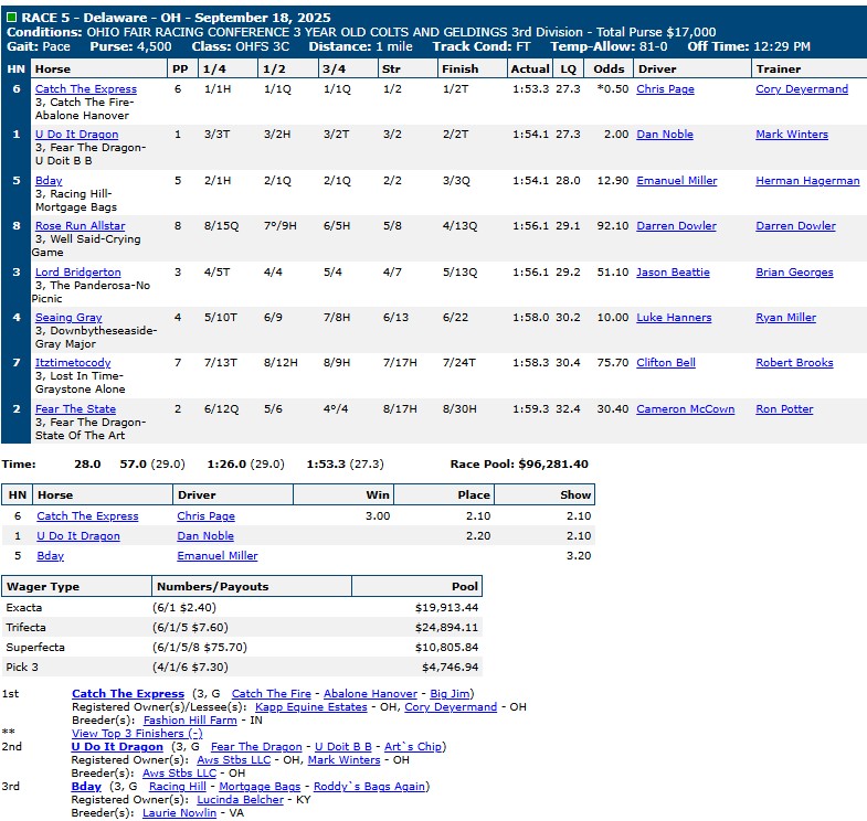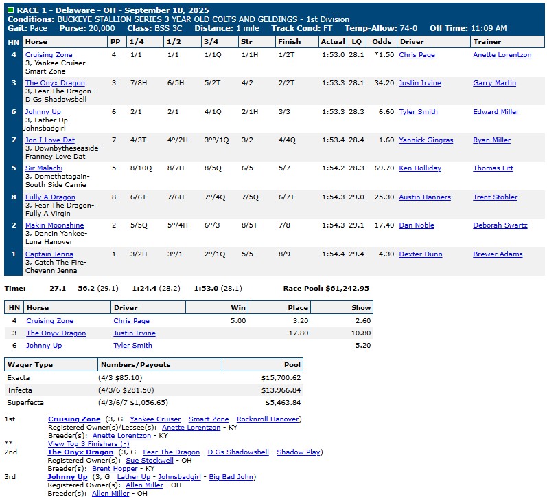 Conditions: OHIO FAIR RACING CONFERENCE 3 YEAR OLD COLTS AND GELDINGS 1st Division – Total Purse $17,000