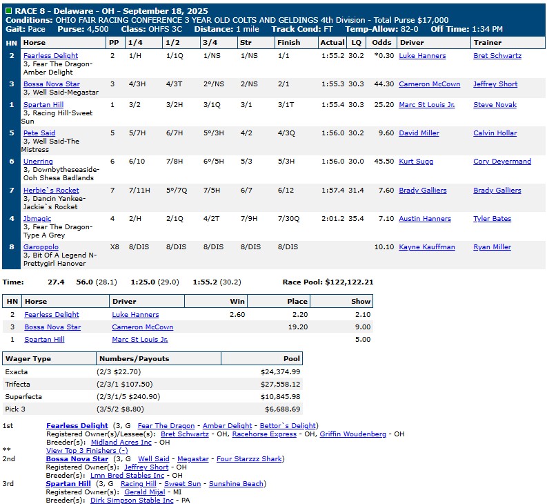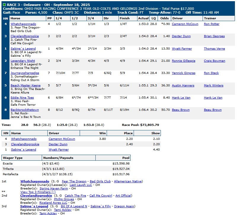 Conditions: OHIO FAIR RACING CONFERENCE 3 YEAR OLD COLTS AND GELDINGS 4th Division – Total Purse $17,000