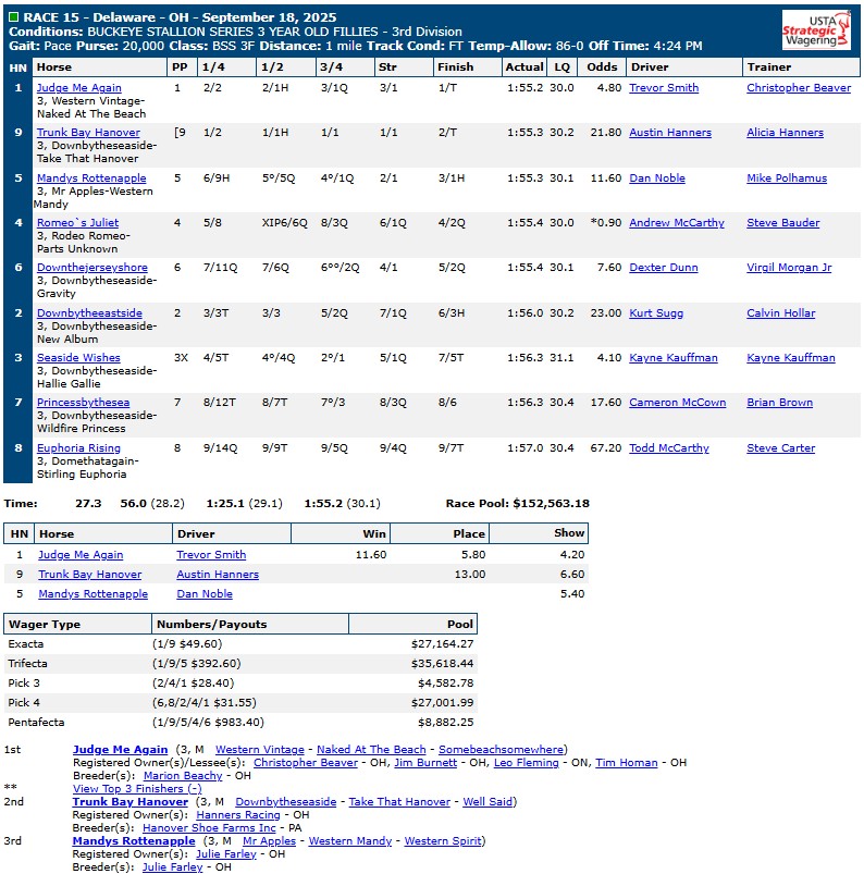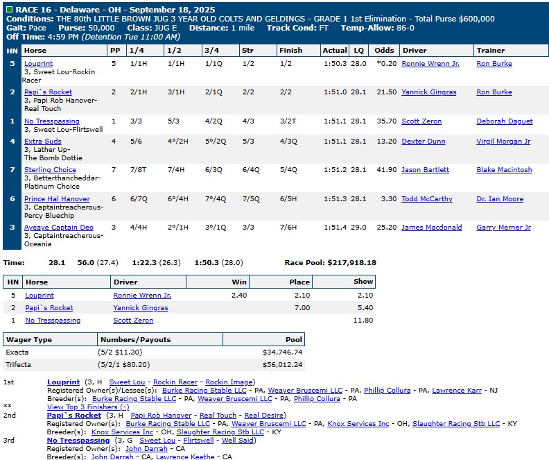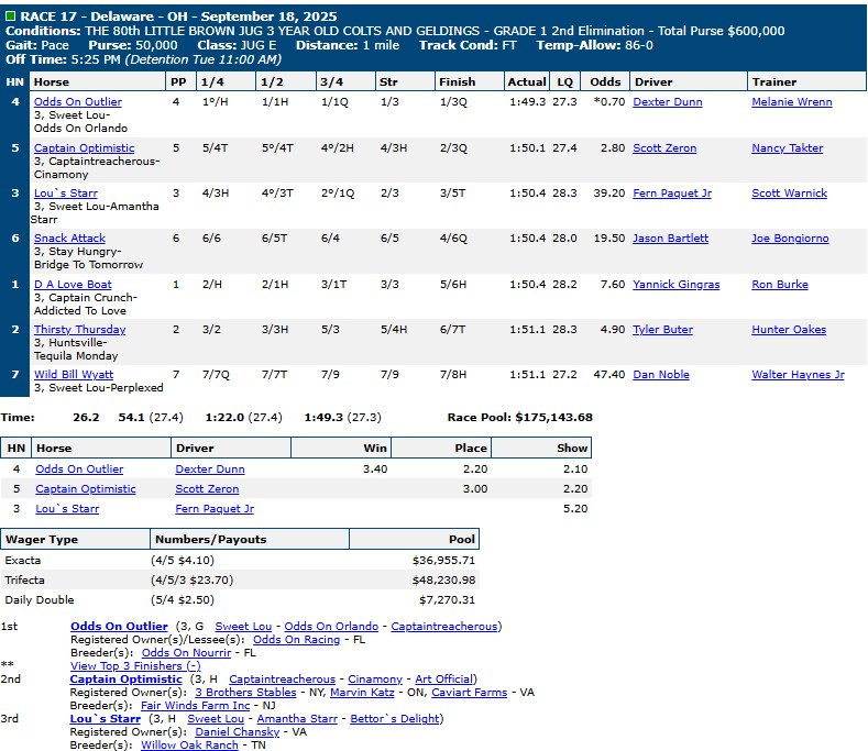 Catch every moment from Little Brown Jug Day at Delaware. Full race videos and official harness racing results from all 20 races held Thursday, September 18 2025, as they become available.