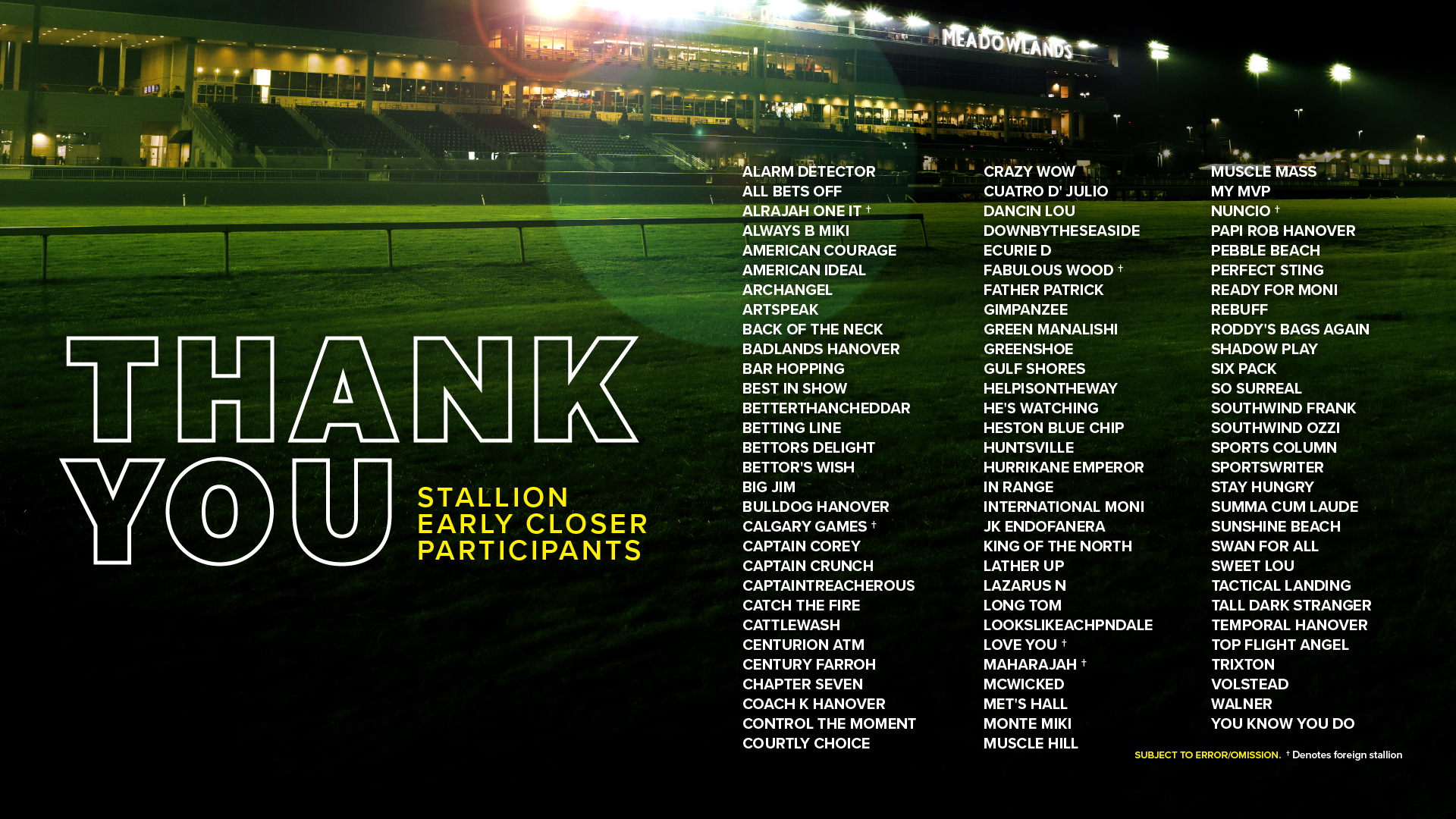 The most up to date list of stallions whose 2024 foals are eligible to nominated to Meadowlands 2026 Early Closing events and other pertinent information may be found on The Meadowlands website.
