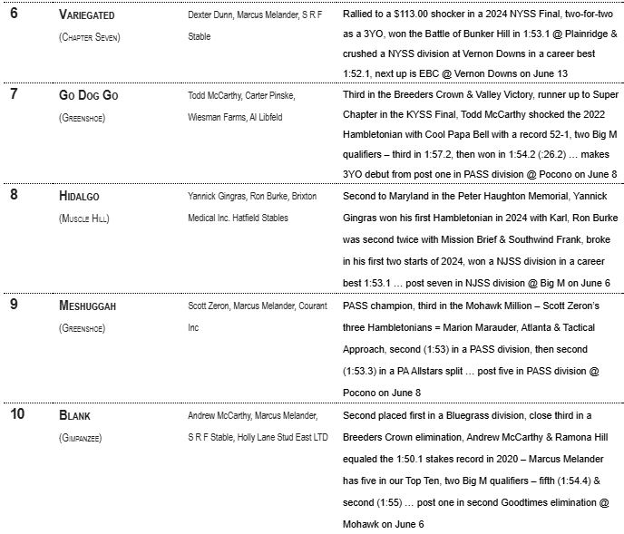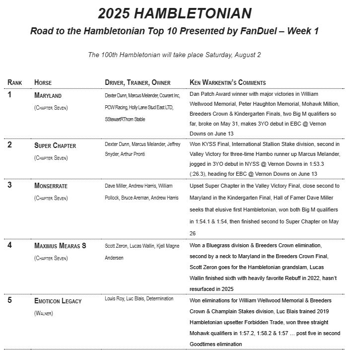 East Rutherford, NJ – This year, Ken Warkentin’s Road to the Hambletonian is presented by FanDuel. Warkentin’s week one features the 2024 Dan Patch 2YO of the Year, Maryland in the top spot. In addition to Maryland, Marcus Melander has four others in the top ten, including #2 Super Chapter, #6 Variegated, #9 Meshuggah and #10 Blank.
