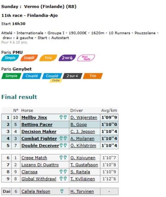 The 35/1 odds pacesetter Combat Fighter (6g From Above-Days Of Glory-Easy Lover) held fourth for Ari Moilanen and trainer Antti Ojanpera, with 4.6/1 odds Double Deceiver (6g Cantab Hall-Sarcy-Donato Hanover) ending fifth for the Orjan Kihlstrom/Stall Zet/Daniel Reden team.